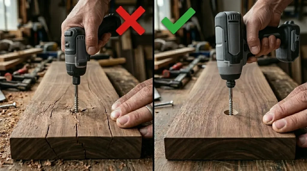 Before drilling into hardwood, always drill a pilot hole. This prevents splitting and ensures screws drive smoothly into the material.