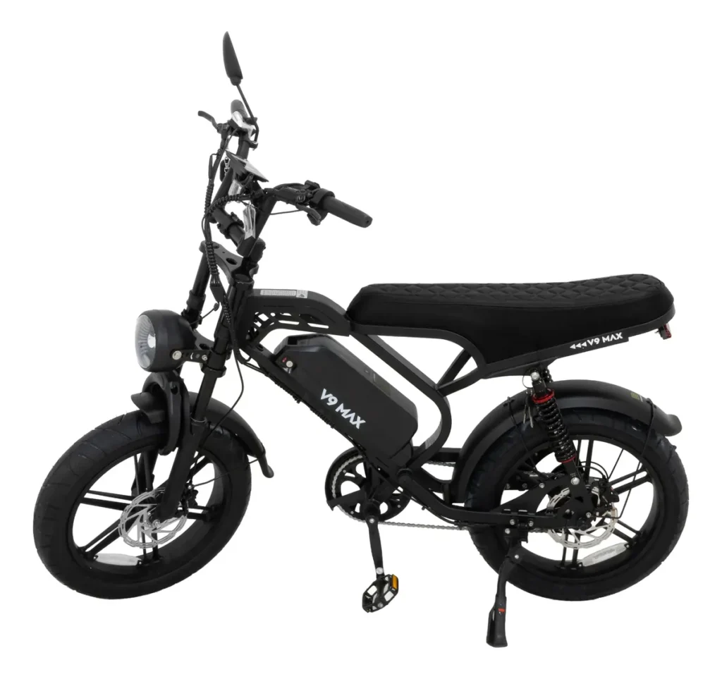 A V9 Max 1000W é uma das bicicletas elétricas mais potentes disponíveis online. Seu motor entrega força suficiente para trajetos longos e subidas íngremes.